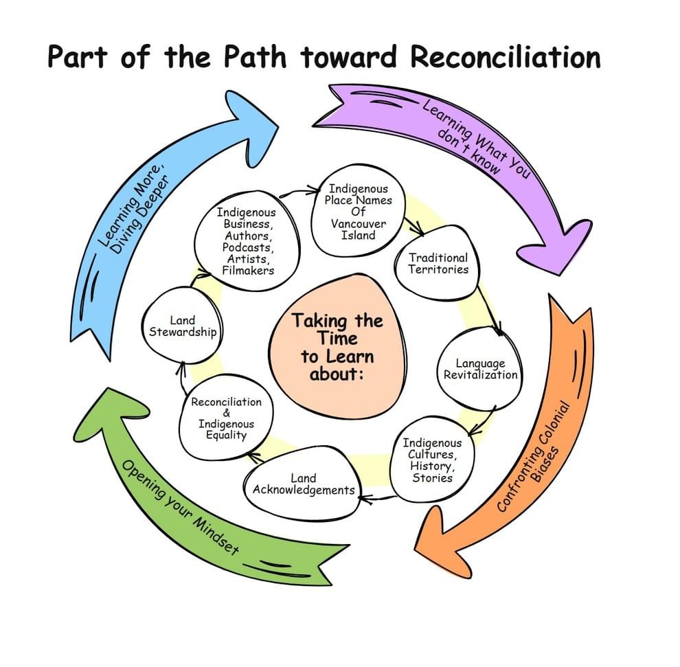 I hope the learning in the brochure and on this website inspires you to do more research on the Indigenous people of Vancouver Island and begin your own reconciliation and ReconciliACTION journey. I invite you to visit the links to Indigenous businesses, authors, film makers and artist found in the resources section on the site, and I hope that it inspires you go further in your own research on the destructive history, laws and polices that the government of Canada and the provinces had and still have towards Indigenous Canadians.